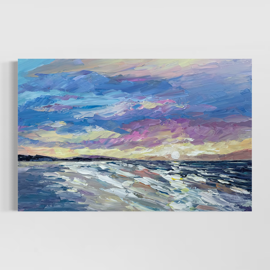 Soft lavender sky, silver-blue waves, and light dancing across the shore. Thick palette-knife strokes create...