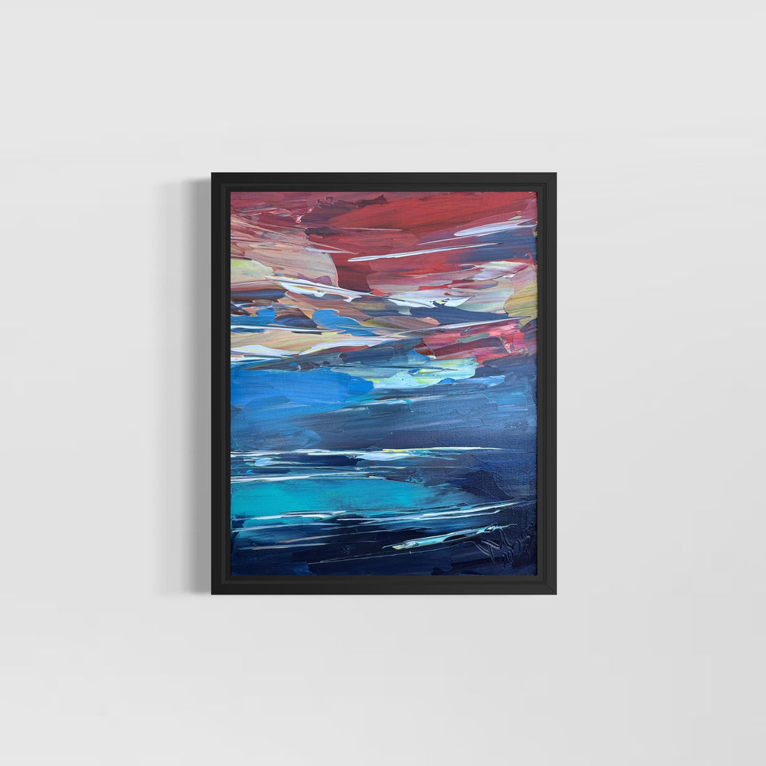 Layers of crimson, peach, and soft gold blend into deep ocean blues, creating a calm...