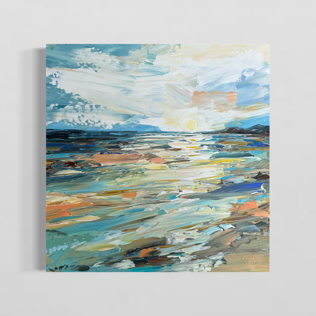 A vibrant yet calming ocean painting filled with movement, light, and rich texture. Bold palette-knife...