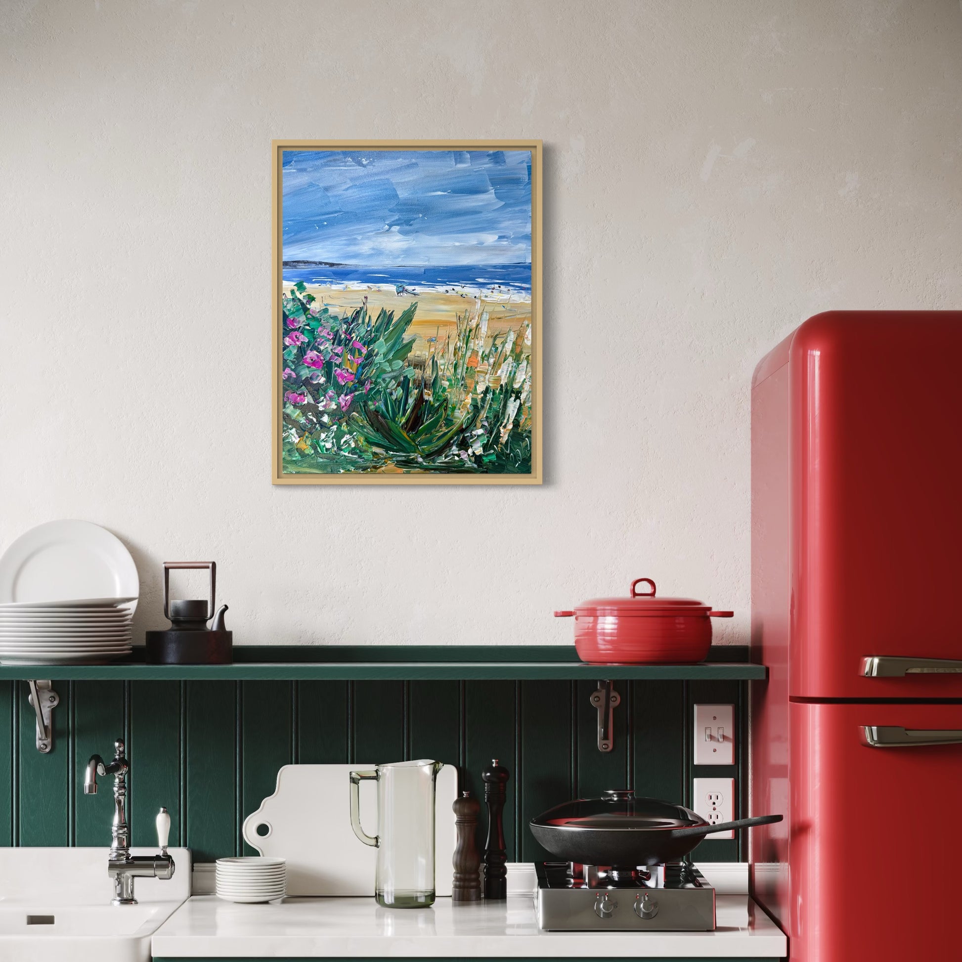 Soft waves, salty air, and a burst of coastal flowers this painting captures the quiet beauty of the shoreline where nature feels both calm and full of life.