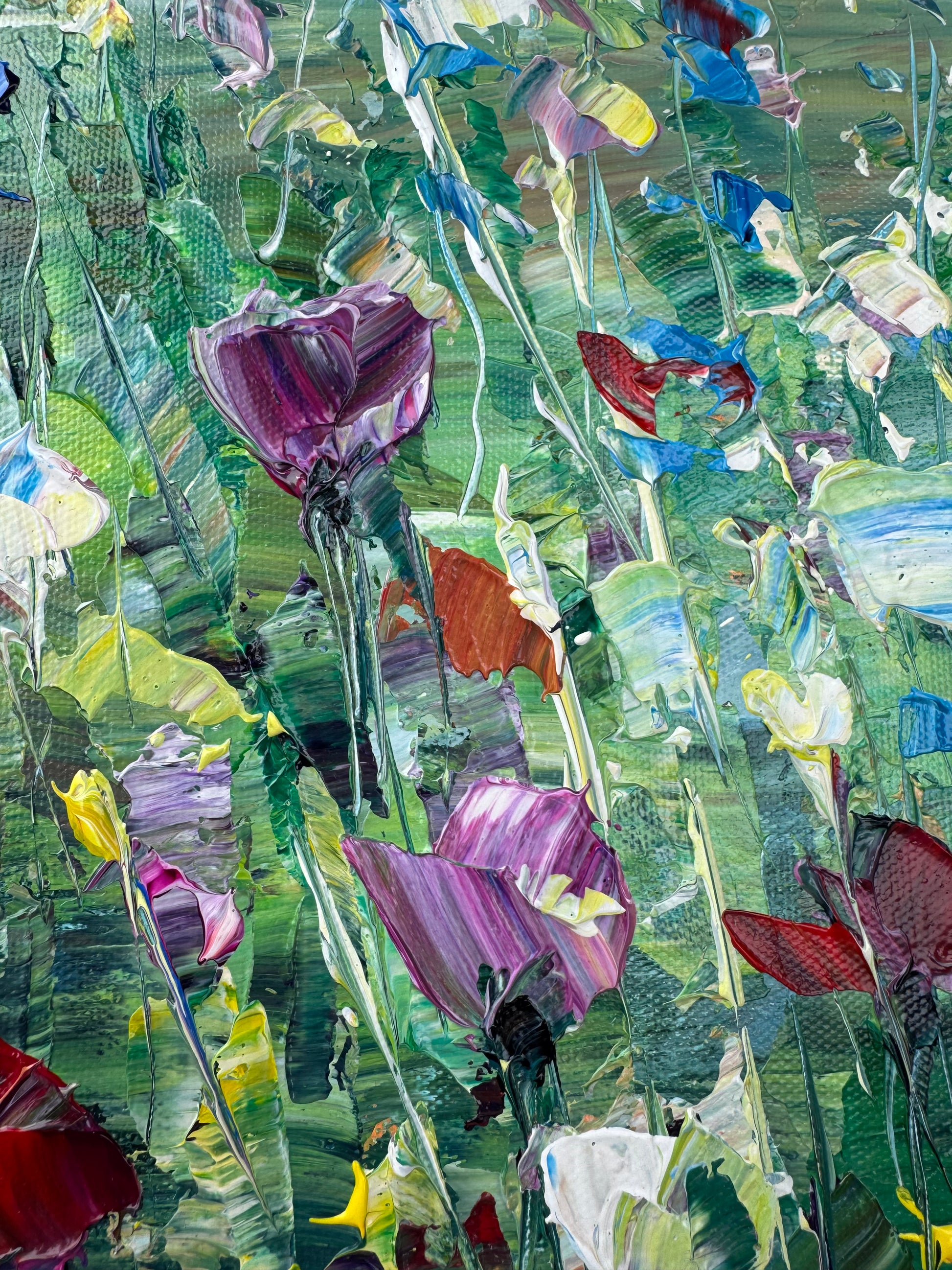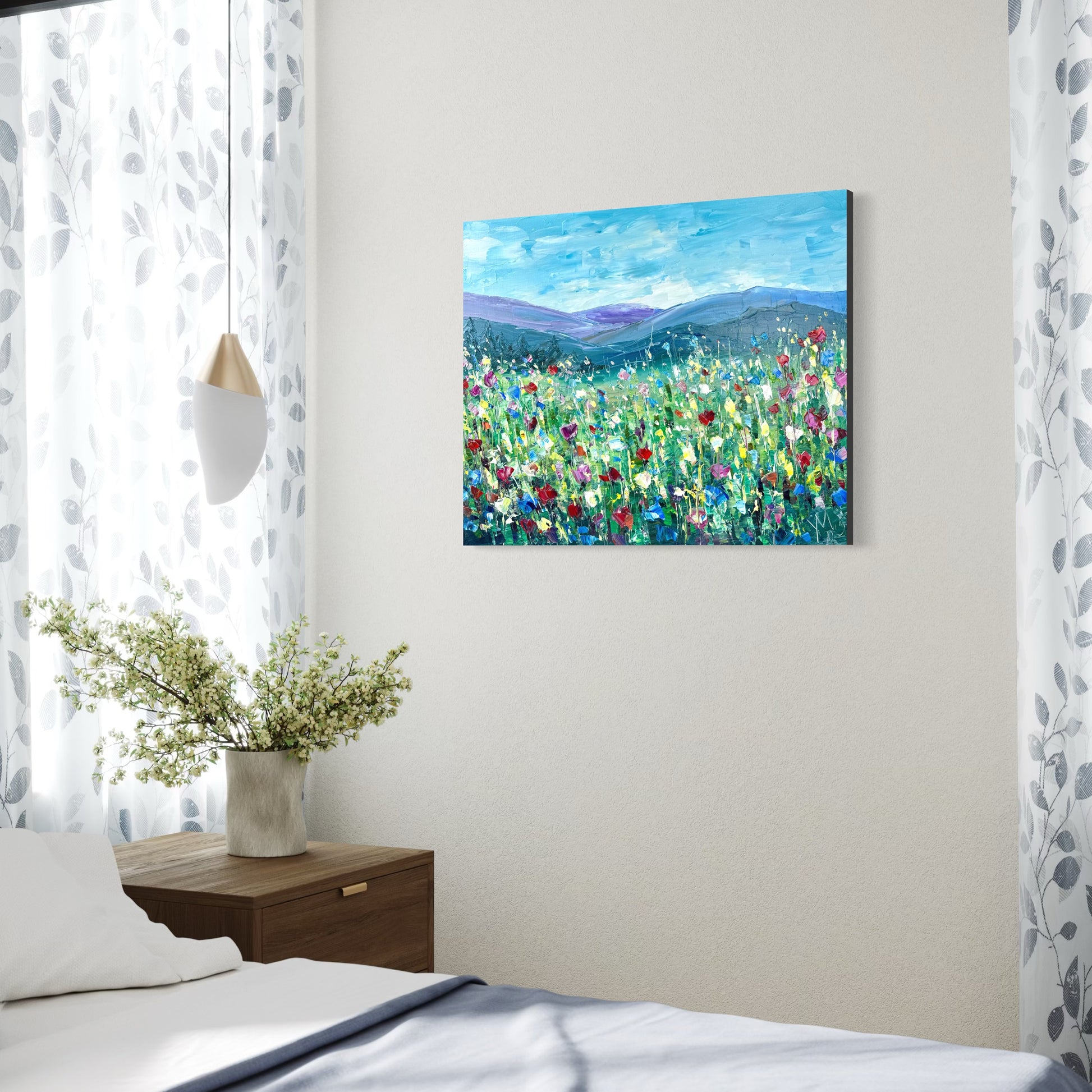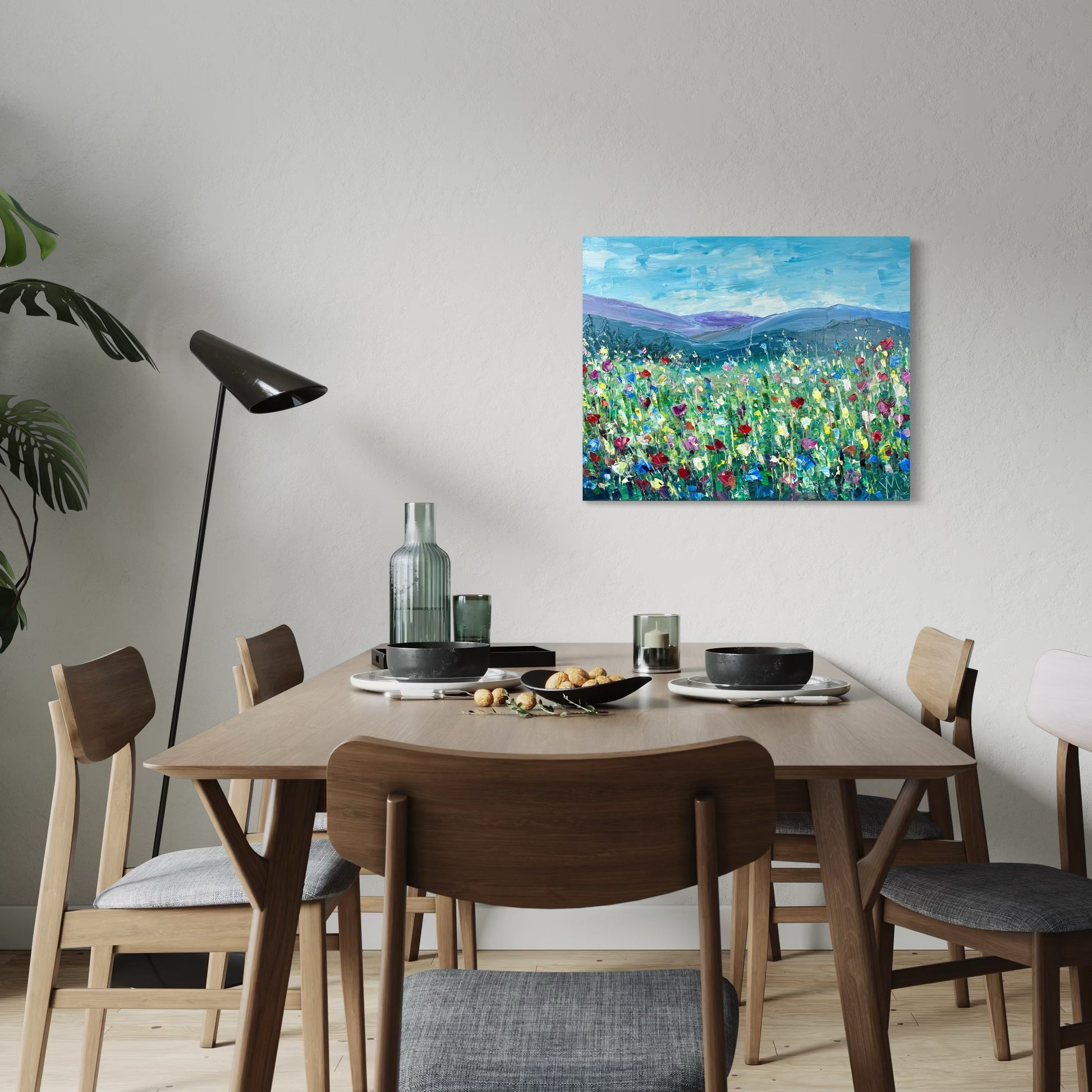A vibrant and textured palette-knife painting inspired by blooming wildflower meadows and soft purple mountains in the distance. Each layer of acrylic brings the flowers to life bright, joyful, and full of movement. The gentle hills and glowing sky add a peaceful sense of space, making this piece feel fresh, uplifting, and filled with summer energy.
