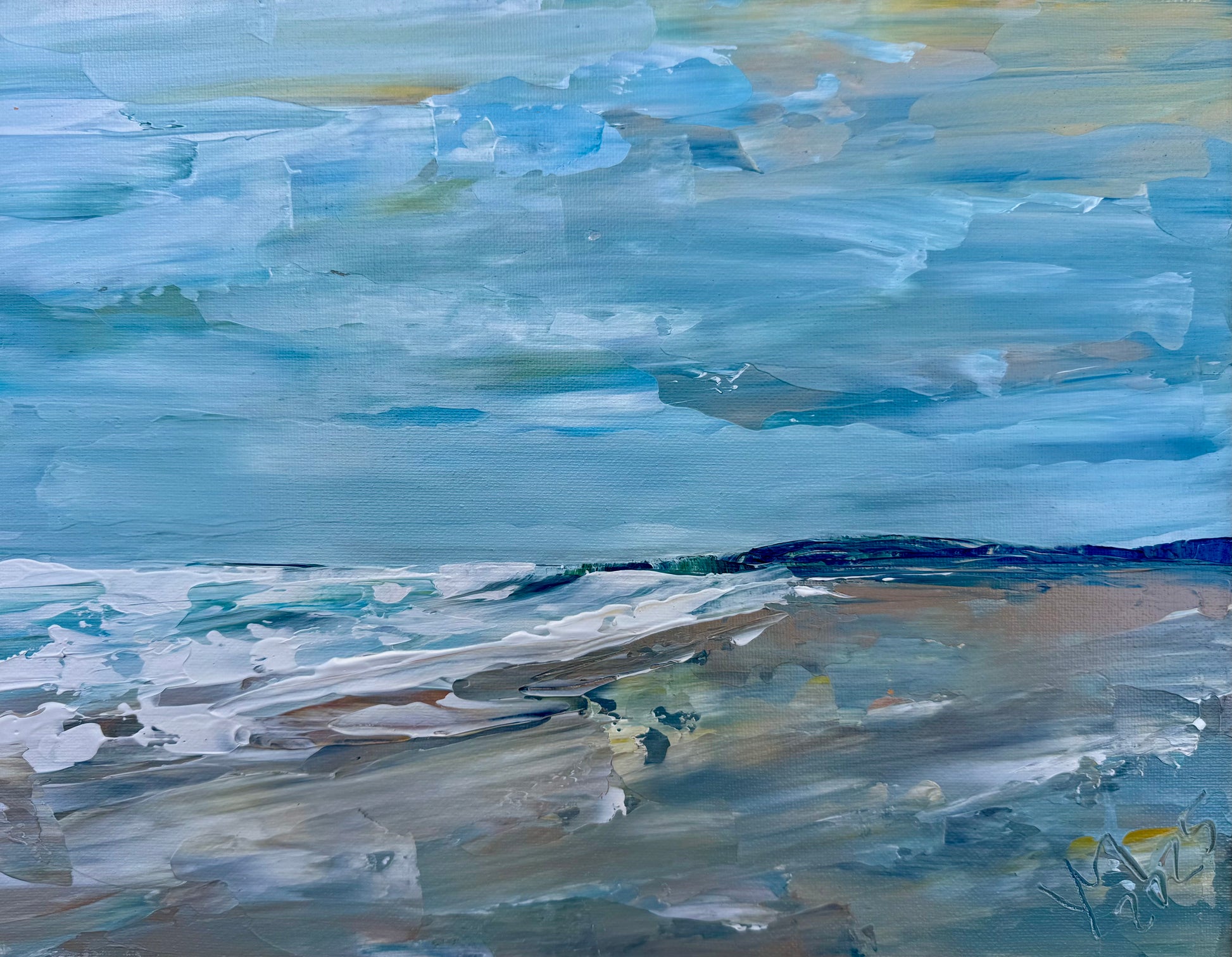 Silver Horizon reflects the calm power of the sea meeting the sky. With shimmering strokes of silver, blue, and soft earthy tones, the painting captures the shifting light of the horizon line. Created entirely with a palette knife, the textured surface brings depth, movement, and a touch of brilliance to the seascape.