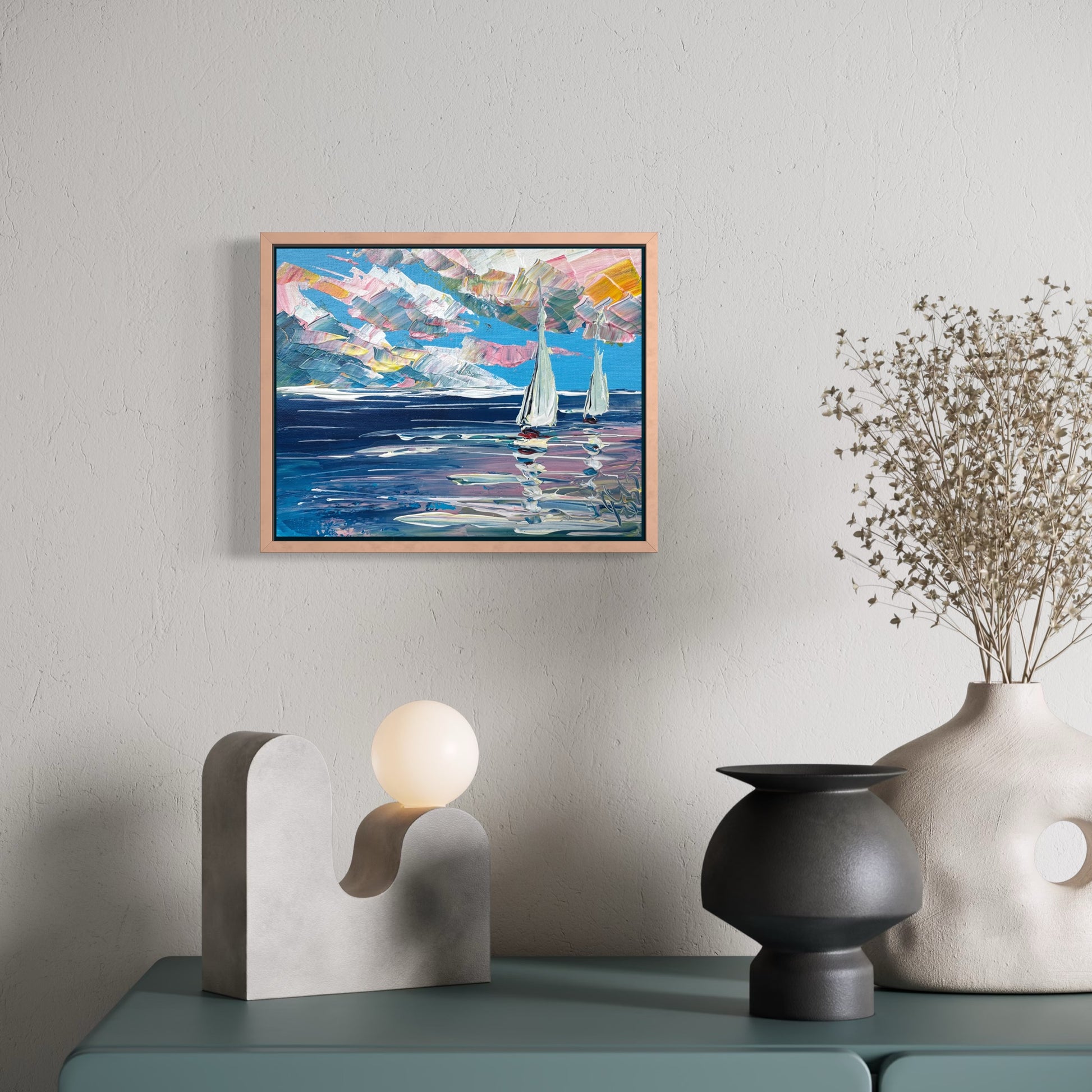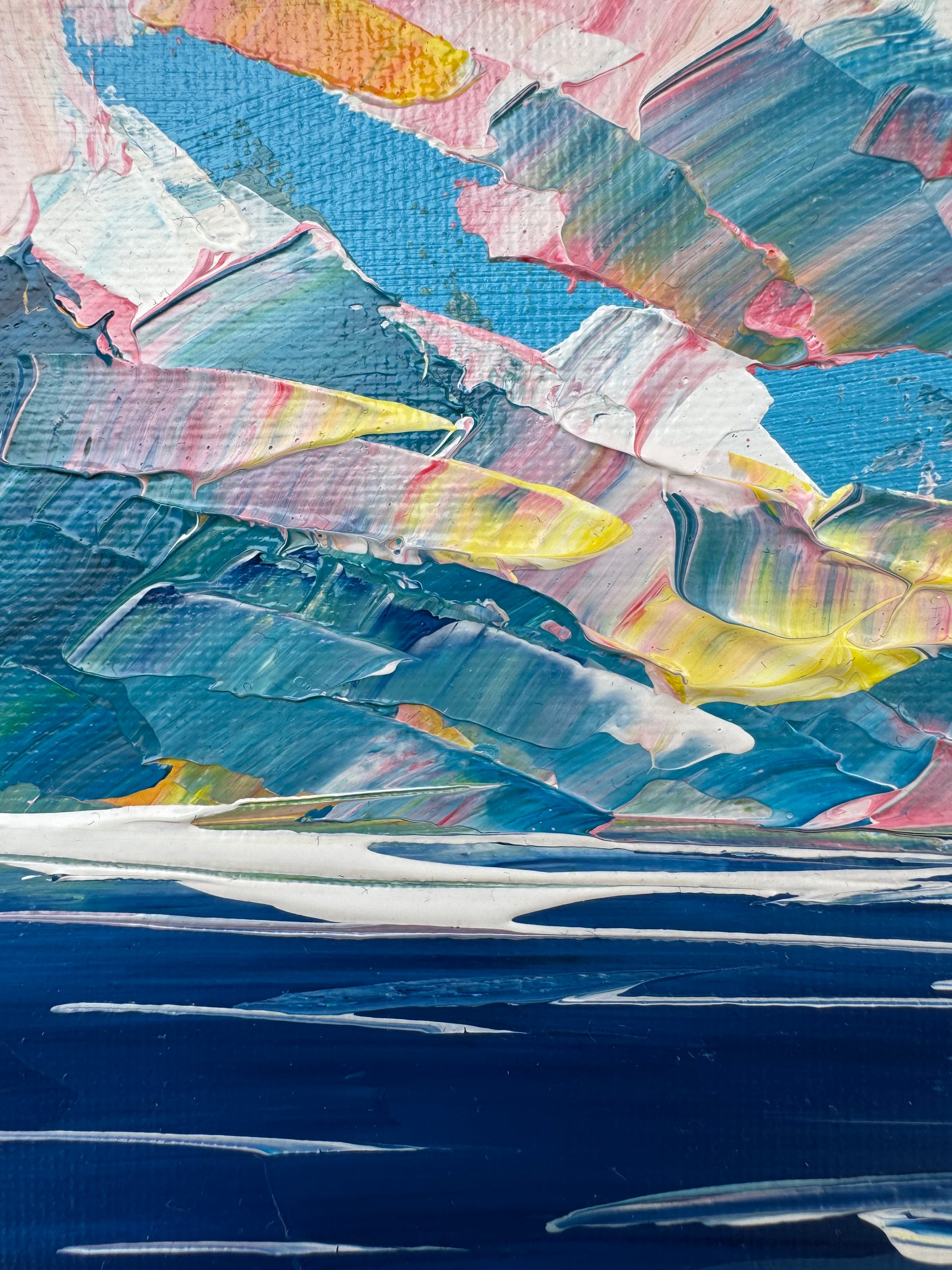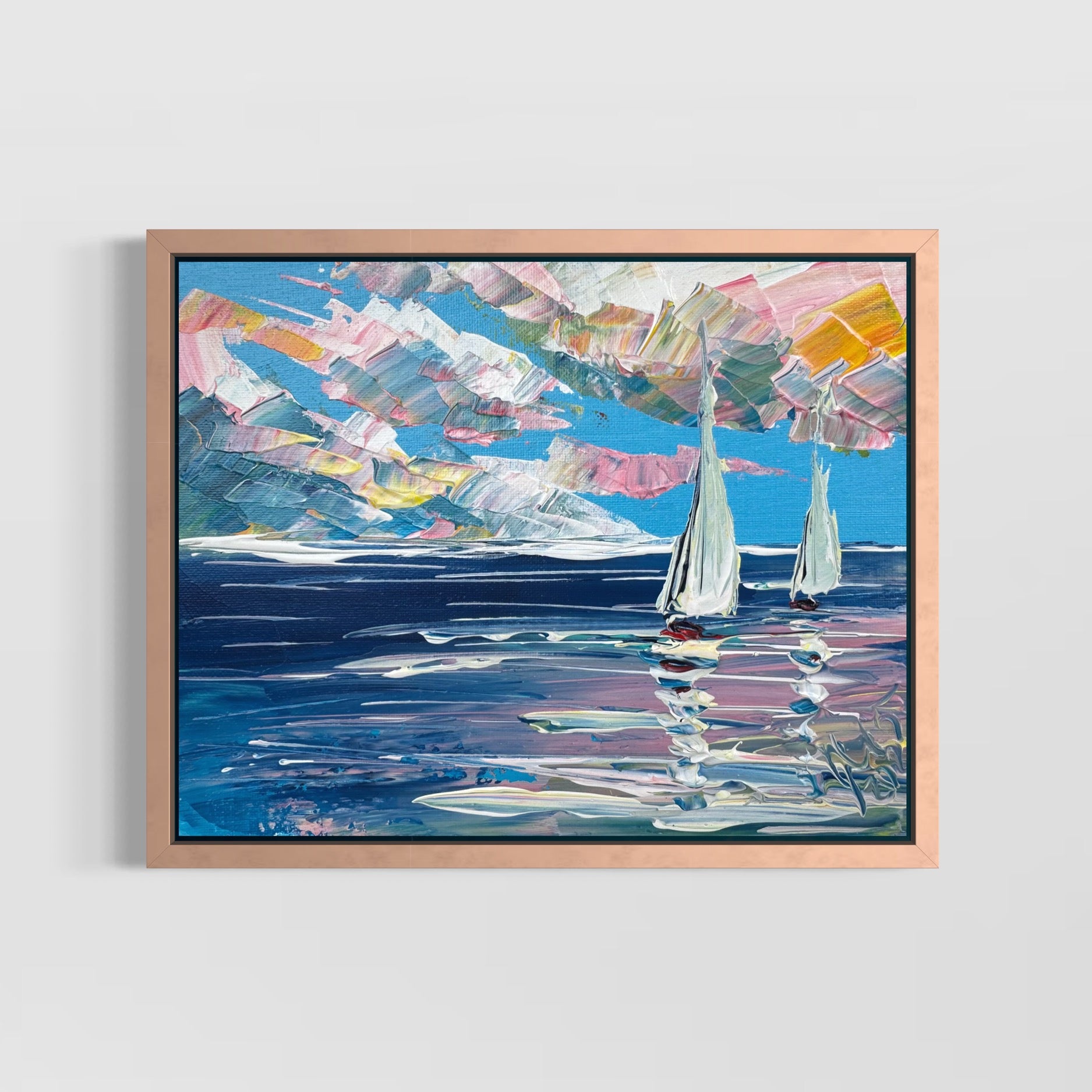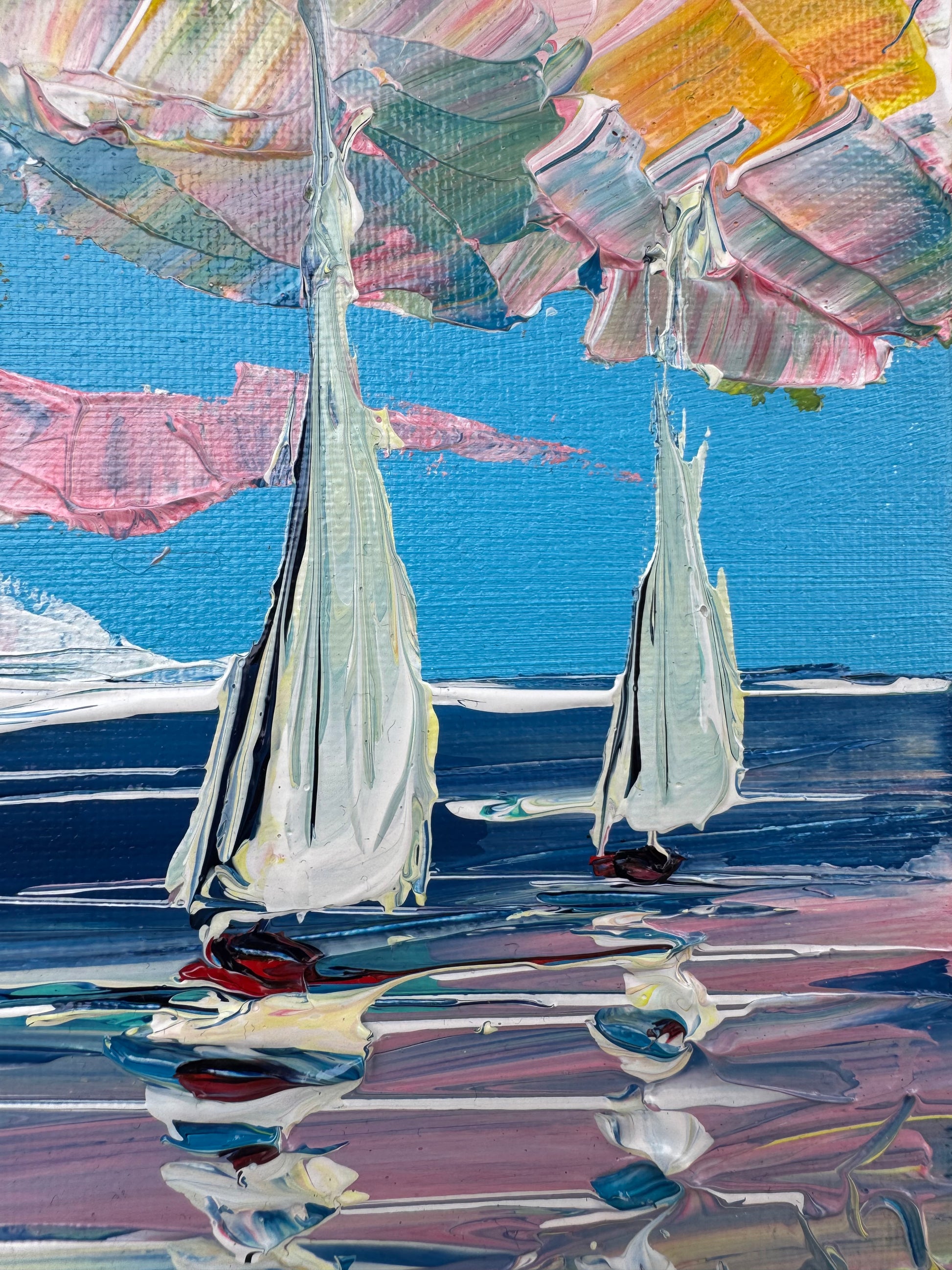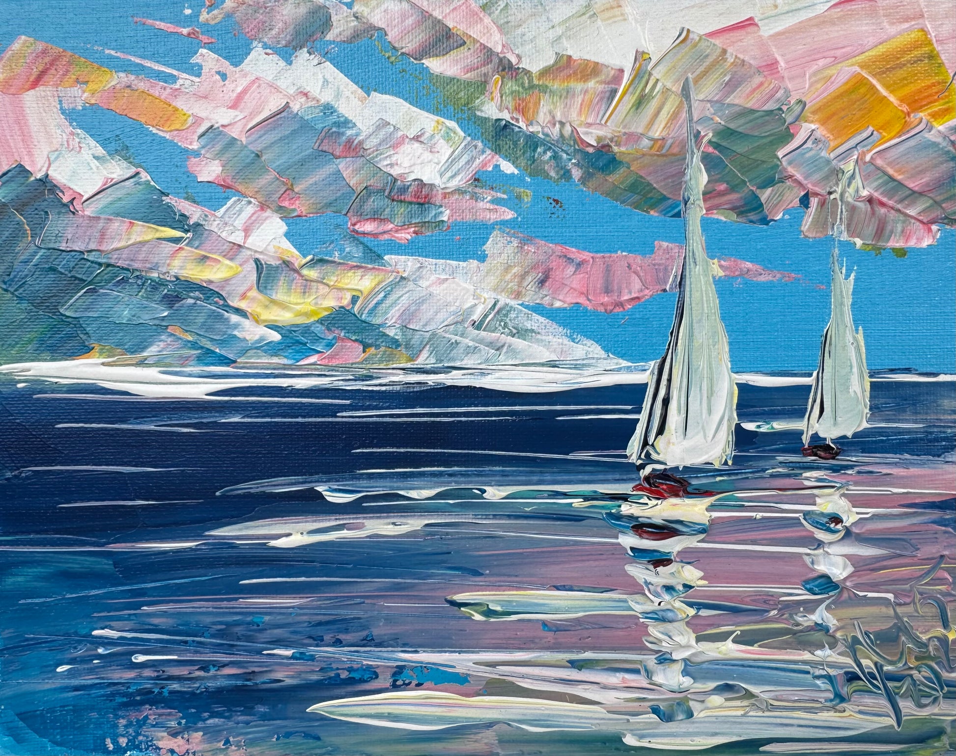 A small painting with a big meaning. Soft pastel clouds reflect on the calm ocean and two sailboats move gently across the water. A peaceful scene filled with light, color and quiet emotion.