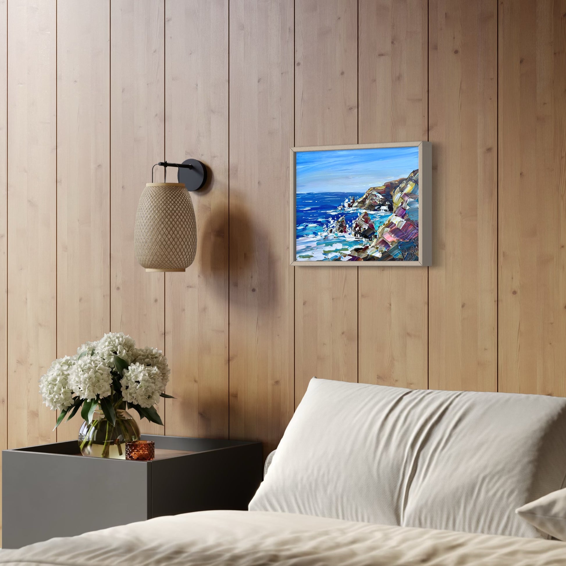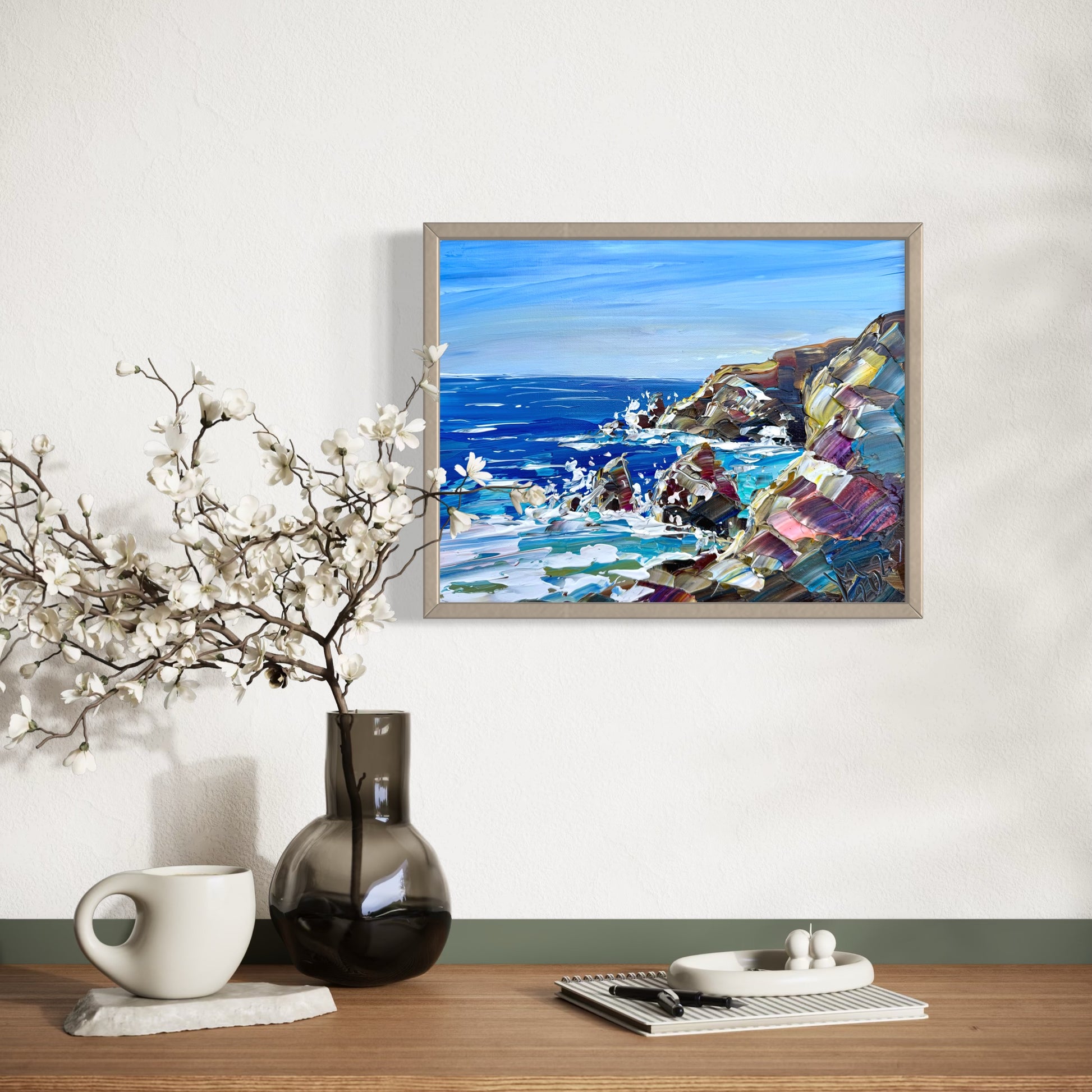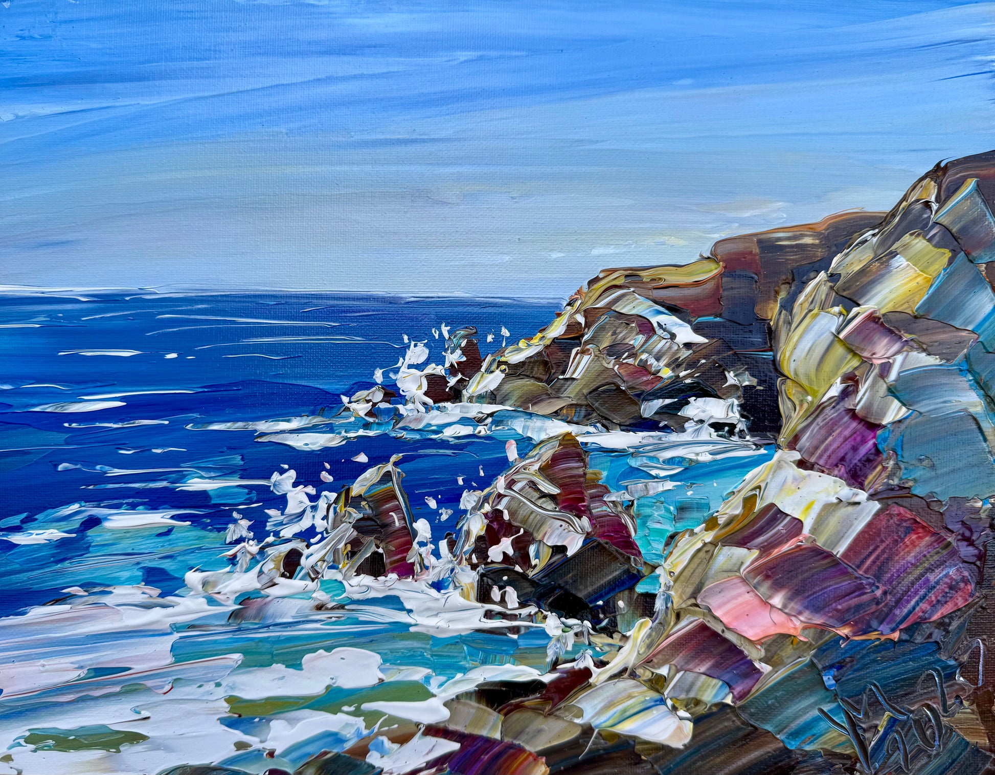 Waves and Rocks captures the raw energy of the ocean as waves crash against the rugged cliffs. Created entirely with a palette knife, the bold textured strokes convey movement, light, and the vibrant spirit of the sea.